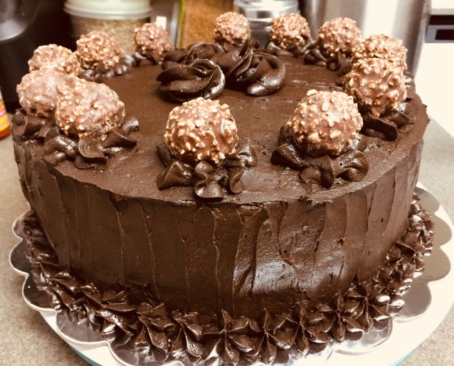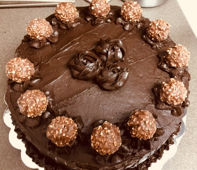 Yes to Ferrero Rocher! They are the only bit of the cake I didn’t make from scratch. He wanted a Ferrero Rocher inspired cake so it has home made nutella, almond cake and chocolate fudge buttercream! It’s going to be extremely rich!