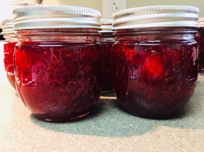Ladle the jam into hot jars leaving 1/4 inch headspace. (Do not ask a fella what this is – we all know what they think 8″ is!!!) Wipe the rim and set the lid on the jar then tighten the band to just finger tight.